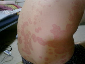 | 9月13日朝 薬のお陰か赤かったブツブツが、痕はあるものの色が薄くなってきました。 病名:「急性多形紅斑」と判明 症状:腕や脚、手足に弓矢の的のような赤い二重丸の発疹ができます。痒みは有ることも無いこともあります。 重症のばあいには 体や顔、粘膜にもできることや 水ぶくれができることもあります。 季節のかわりめの春や秋に 出るかたも 多くみられます。 |